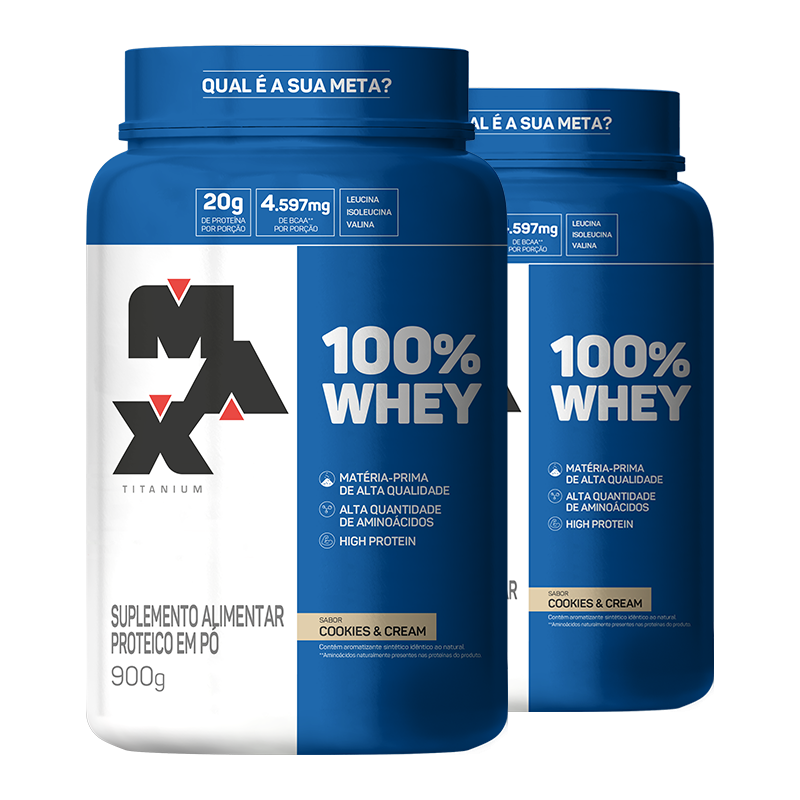 100% Whey Protein (900g) Max Titanium é um suplemento a base de proteína concentrada do soro do leite (Whey Protein Concentrate), matéria-prima elaborada com alta tecnologia, de elevado valor biológico, rápida digestibilidade e alta concentração de aminoácidos essenciais, que são fatores de relevância para auxiliar a síntese proteica muscular. O consumo de suplementos proteicos, associado à uma alimentação saudável e prática de atividade física auxilia na formação de músculos e ossos. 100% Whey fornece 20g de proteína, 4.597 mg de BCAAs e 10,1g de aminoácidos essenciais em 30g de produto.